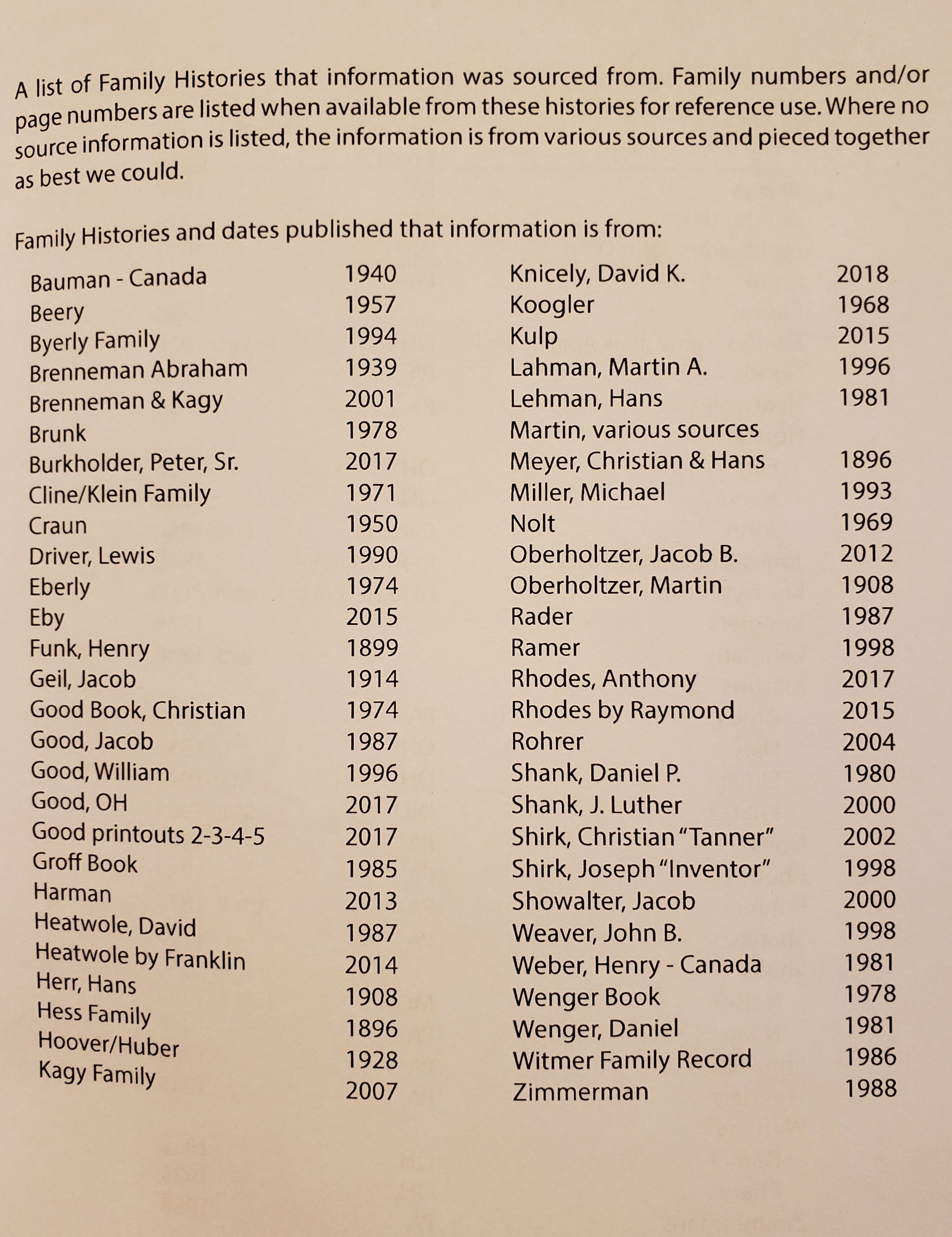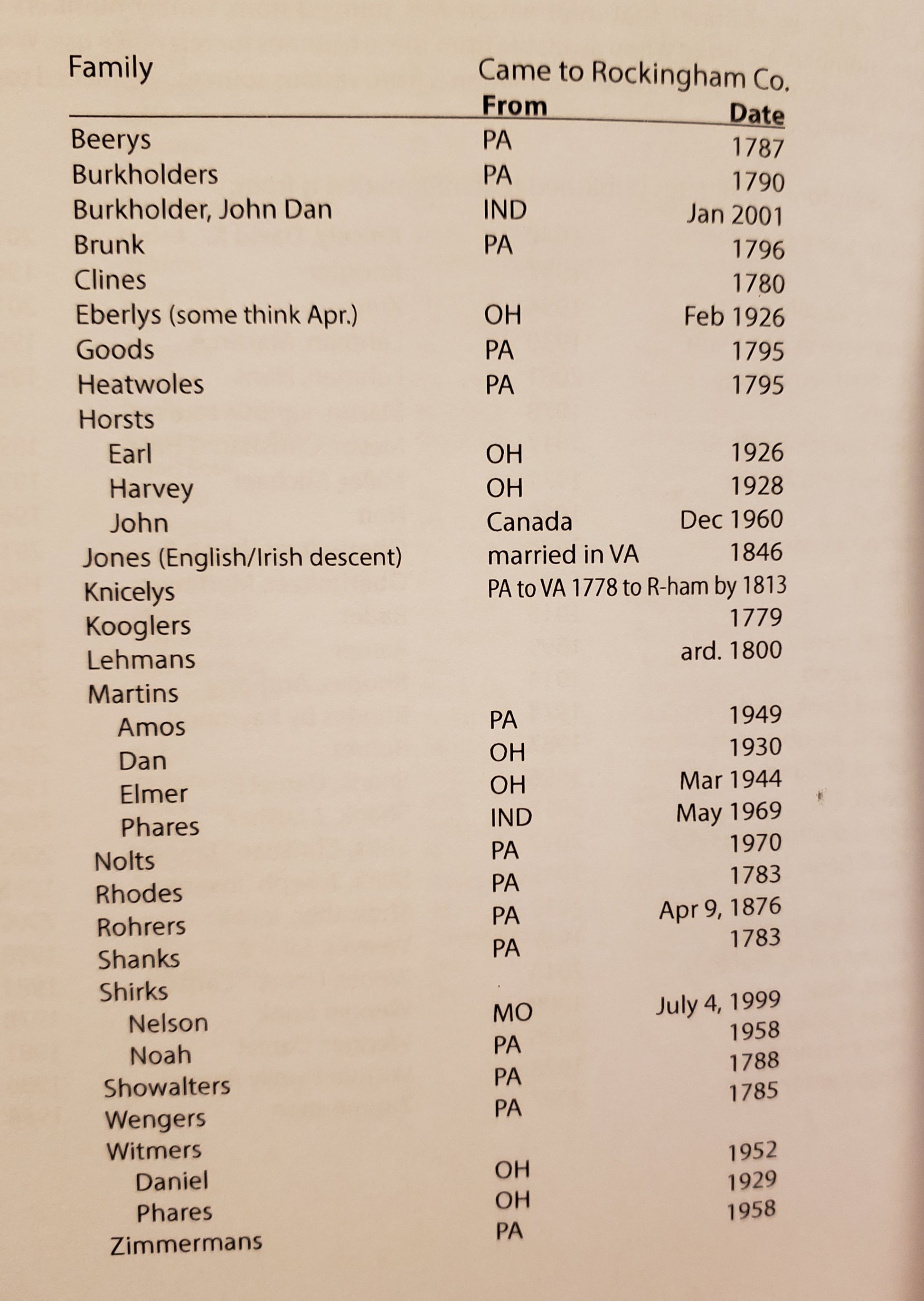 Surnames including: Beery, Burkholder, Brunk, Cline, Eberly, Good, Heatwole, Horst, Jones, Knicely, Koogler, Lehman, Martin, Nolt, Rhodes, Rohrer, Shank, Shirk, Showalter, Wenger, Witmer, Zimmerman. Family members from this group came to Rockingham County, Virginia, as early as 1783.
