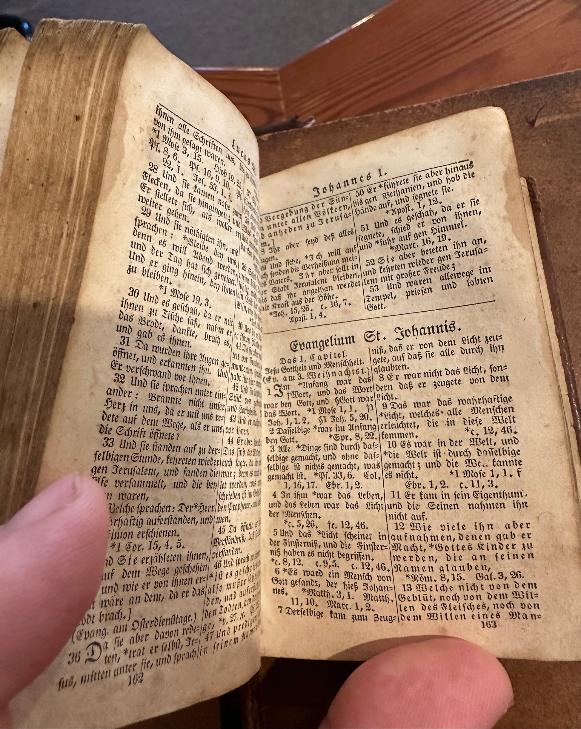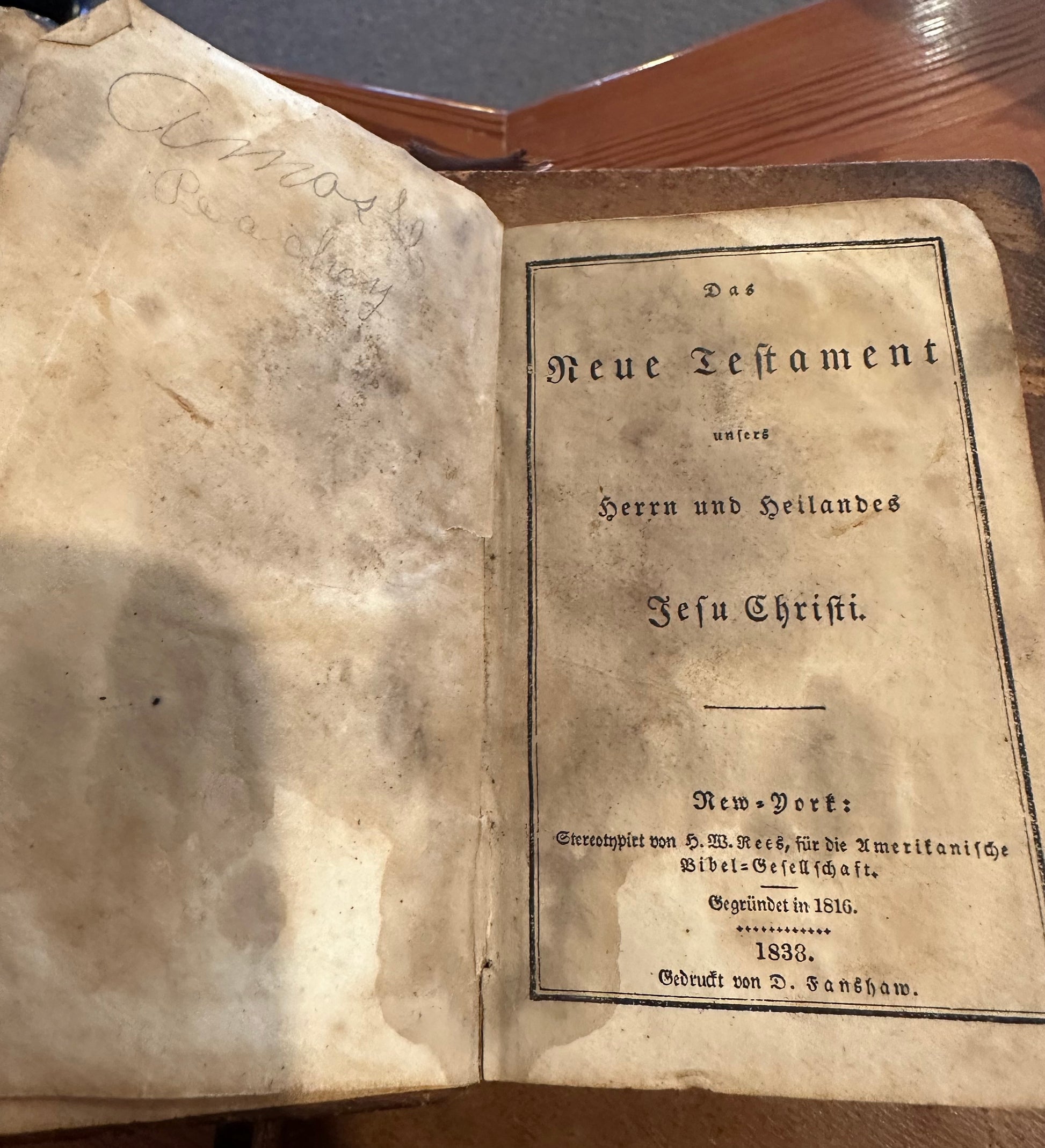 A rare and very old pocket New Testament in German. Inscribed "Amos Peachey" in pencil and "L. Jordan, 1843" in ink.