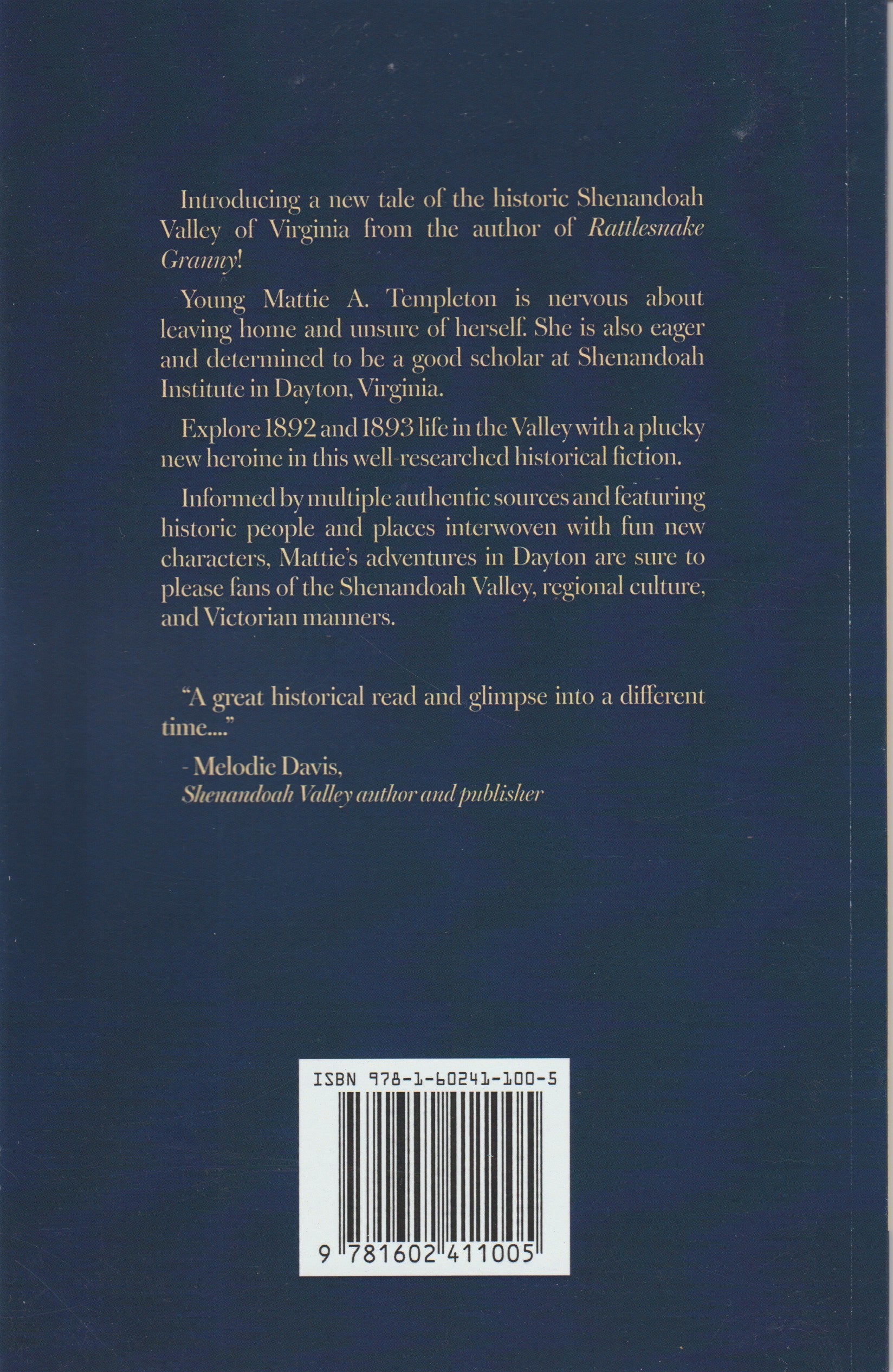 Informed by multiple authentic sources and featuring historic people and places interwoven with fun new characters, Mattie's adventures in Dayton are sure to please fans of the Shenandoah Valley, regional culture, and Victorian manners.