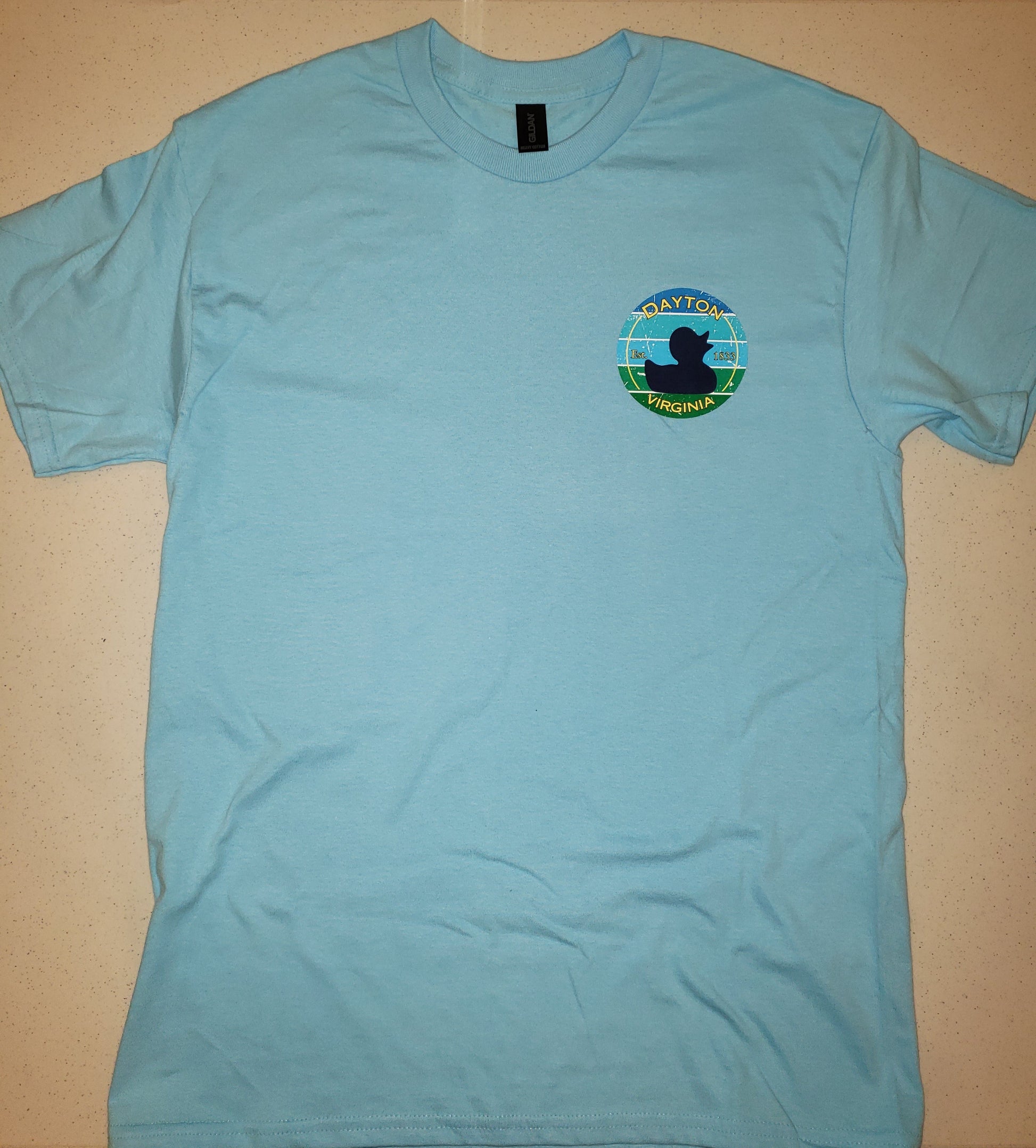 100% cotton with Dayton, Virginia Est. 1833 Duck logo; Sky Blue short sleeve crew neck
